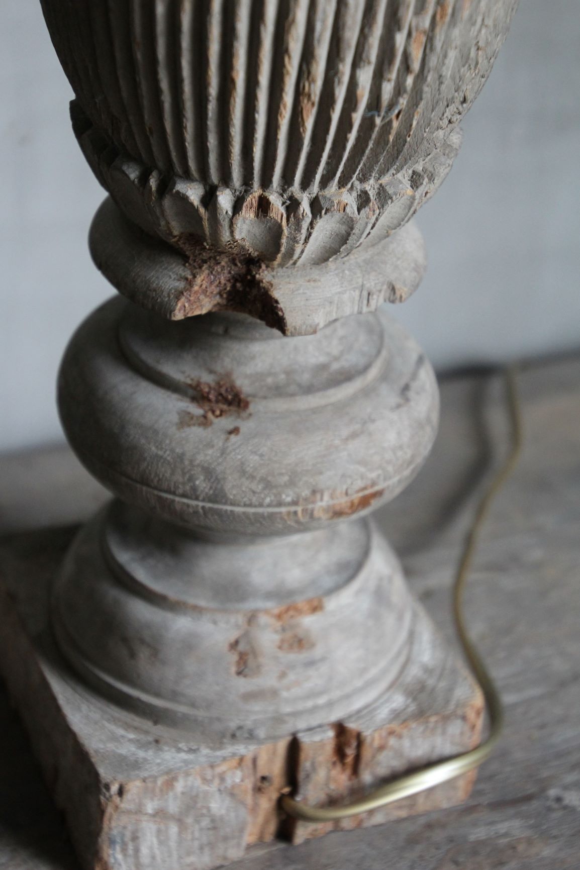 Mooie houten balusterlamp van Aura Peeperkorn. Deze oude balusterlampen zijn allemaal uniek en de naden, scheuren en butsen zijn een kenmerk van het authentieke karakter van de baluster.