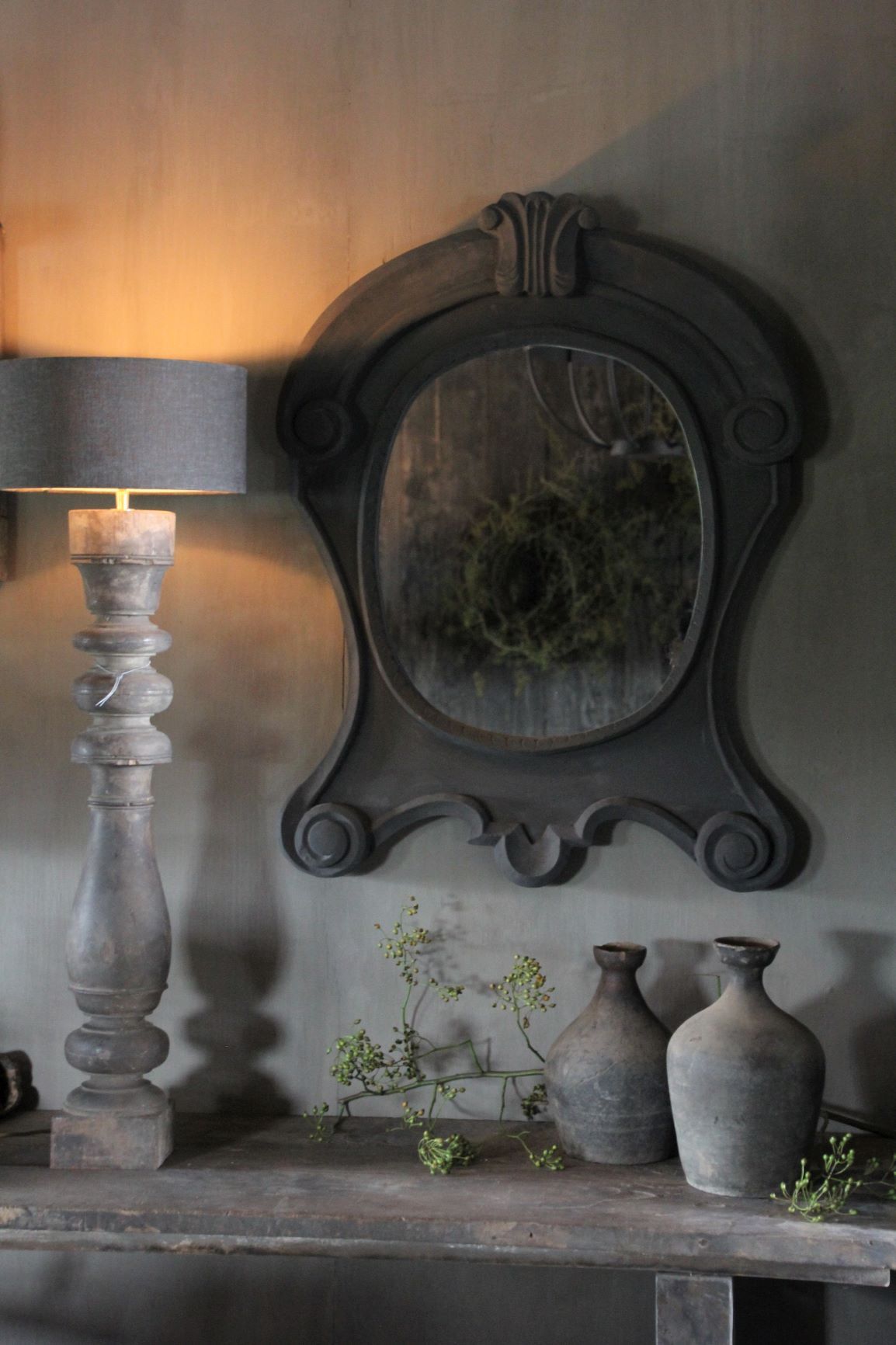 Donkergrijze ossenoogspiegel die vooral geschikt is om op te hangen. Hoogte 90 cm, breedte 68 cm en diepte 10 cm.